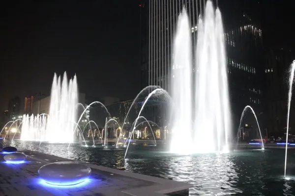 La façade du show aquatique est de 150 mètres avec des effets aquatiques modernes, des lignes nettes pour épouser l’aspect contemporain de la place.