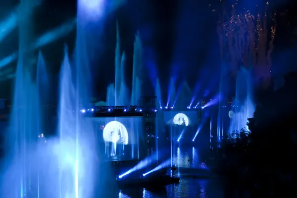 Ce spectacle retrace 100 ans de la production cinématographique au travers de projections géantes sur écrans d’eau et rideaux d’eau en haute définition.